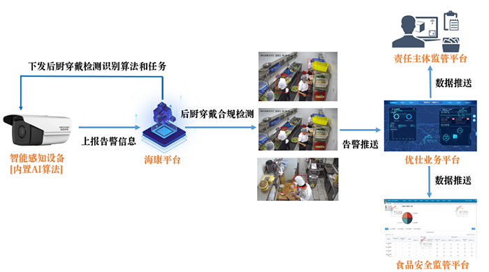優仕響應國家市場監管總局對“明廚亮灶”工作部署要求,以及教育局對學校食品安全監管的實際需要,采用“視頻+AI” 技術,借助海康威視AI開放平臺訓練的場景化AI算法,構建集智能事件預警、處置、統計等功能為一體的“智慧食安”解決方案。