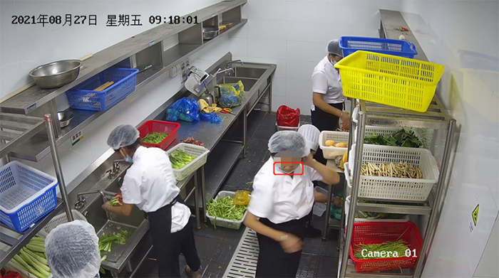內置AI算法的智能感知設備采集視頻數據,并對視頻數據智能分析,實現對后廚人員的廚師服、廚師帽、工作口罩穿戴等識別功能。